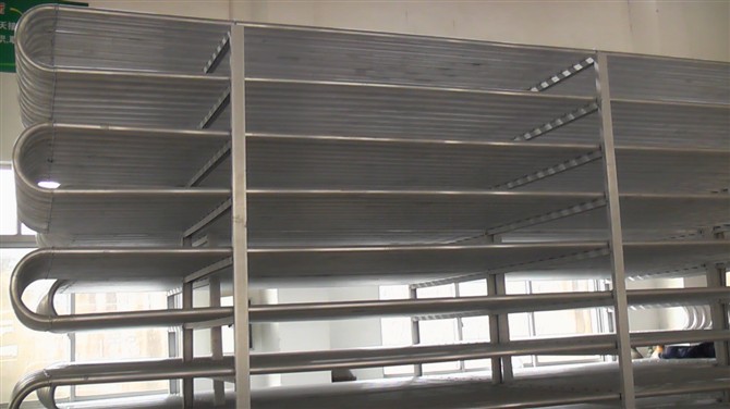 作為新型冷庫蒸發器鋁排管速凍擱架具有以下優點:1、鋁材傳熱能力好,相同換熱量下鋁排管的用量要少于鋼排管。2、和傳統鋼排管相比鋁排速凍擱架具有用不生銹的優點。3、用于鋁排管用量少可以大大的降低制冷劑的充注量。4、環保材料節約能源保護環境。